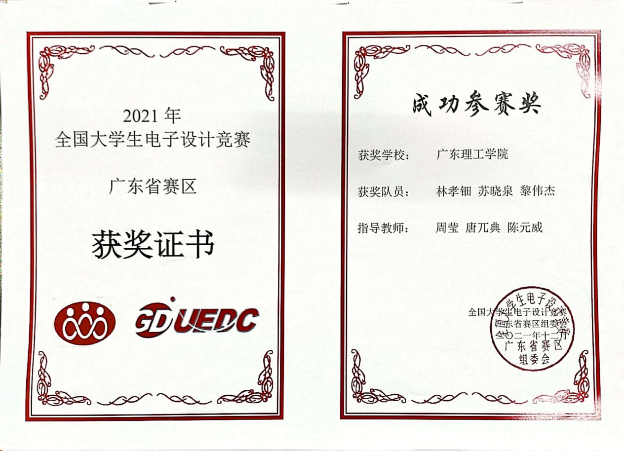 2021年全国老员工电子设计竞赛广东赛区 成功参赛奖 |