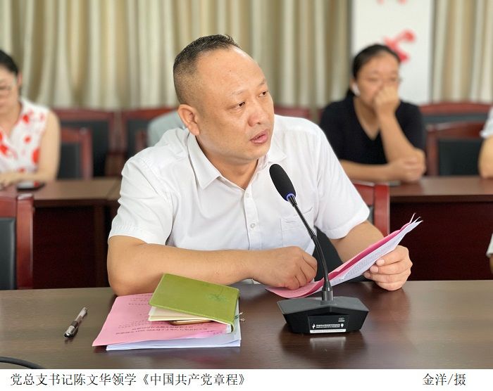 陈文华领学《中国共产党章程》。他强调,党章为党员干部的行政决策指明了方向,知方向才不会误入歧途,知界限才不会逾越,全体党员教师要加强党章学习,要逐字逐句学、原原本本学、反反复复学、联系实际学、深入思考学,确保学深悟透,做到知其然,更知其所以然,切实将党章党规党纪内化于心,外化于行,做到以学促思、以思促行,以行促效。