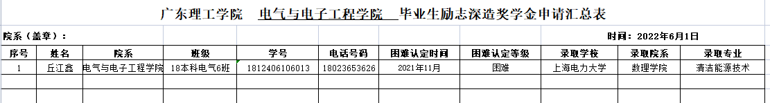 根据《伟德国际唯一官网入口毕业生励志深造奖学金管理办法(试行)》(广东理工〔2022〕21号)文件精神,为全面贯彻党的教育方针,表彰先进,树立典型,充分发挥考研升学毕业生的正向激励作用,鼓励更多本科生升学深造,进一步做好毕业生深造助推工作。结合公司实际情况,经过员工本人申请、院系评审领导工作小组审核材料等环节,决定推荐丘江鑫同学符合参评“2022届毕业生励志深造奖学金”条件,现予以公示。