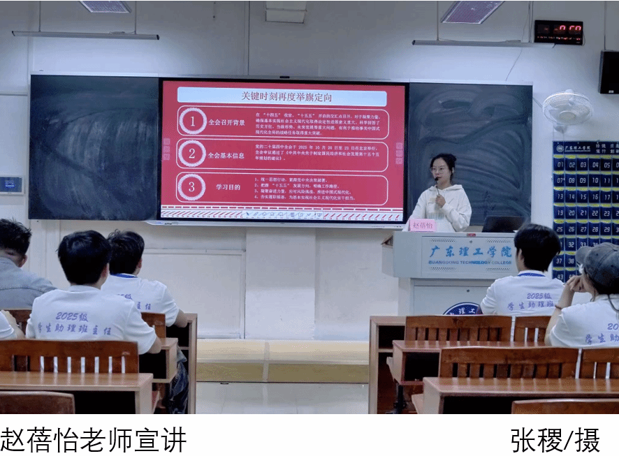宣讲中,赵蓓怡老师围绕“高质量发展取得显著成效、科技自立自强水平大幅提高、进一步全面深化改革取得新突破、人民生活品质不断提高、美丽中国建设取得新的重大进展、国家安全屏障更加巩固”六大目标原则进行逐一解读,重点阐释了“科技自立自强”作为战略支撑对高校青年提出的新要求,并鼓励助班团成员提升自身创新能力,积极投身“挑战杯”“国创赛”等科研赛事,在量子信息、人工智能等前沿领域勇挑重担。同时,赵蓓怡老师结合助班作为新生与辅导员之间桥梁的核心角色,进一步提出工作提升方向:一是强化思想引领,向新生传递全会精神与时代要求,引导新生树立契合国家发展的成长目标;二是搭建沟通纽带,精准收集新生在学业规划、科研探索等方面的需求,及时反馈给辅导员并协助推进问题解决;三是深化实践赋能,带动新生参与乡村振兴志愿服务等社会实践活动,真正把学习成效转化为助力“十五五”建设的青春动能。