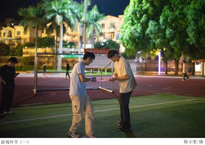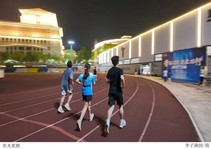 19点30分,参赛选手们佩戴着荧光手环,汇聚成大本营,进行签到。人群如流动的星带涌向跑道,荧光手环在夜色中划出璀璨轨迹;有人奋力冲刺,挑战自我极限;有人结伴慢跑,享受晚风与友伴的笑语;亦有队伍高呼口号,以整齐步伐展现团队默契。跑道边,工作人员用镜头记录下汗水与笑容交织的瞬间,荧光装备与月光交相辉映,将操场装点成青春不眠的舞台。
