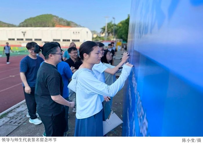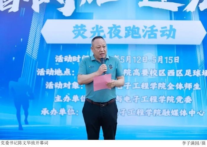 17时整。公司党委书记陈文华代表全体教职工向筹备活动的工作人员致谢,并对参与师生表达欢迎。他提到,荧光夜跑是青春与运动的完美融合,鼓励同学们在奔跑中释放压力、锤炼意志,践行健康生活理念,同时感受团队协作的力量。发言最后,他郑重宣布活动正式开幕,并叮嘱全体参与者注重安全,在工作人员的指引下有序奔跑。随着领导与师生代表在海报上签名留念,现场掌声雷动,跃动的笔触承载着对活动的期待与承诺。