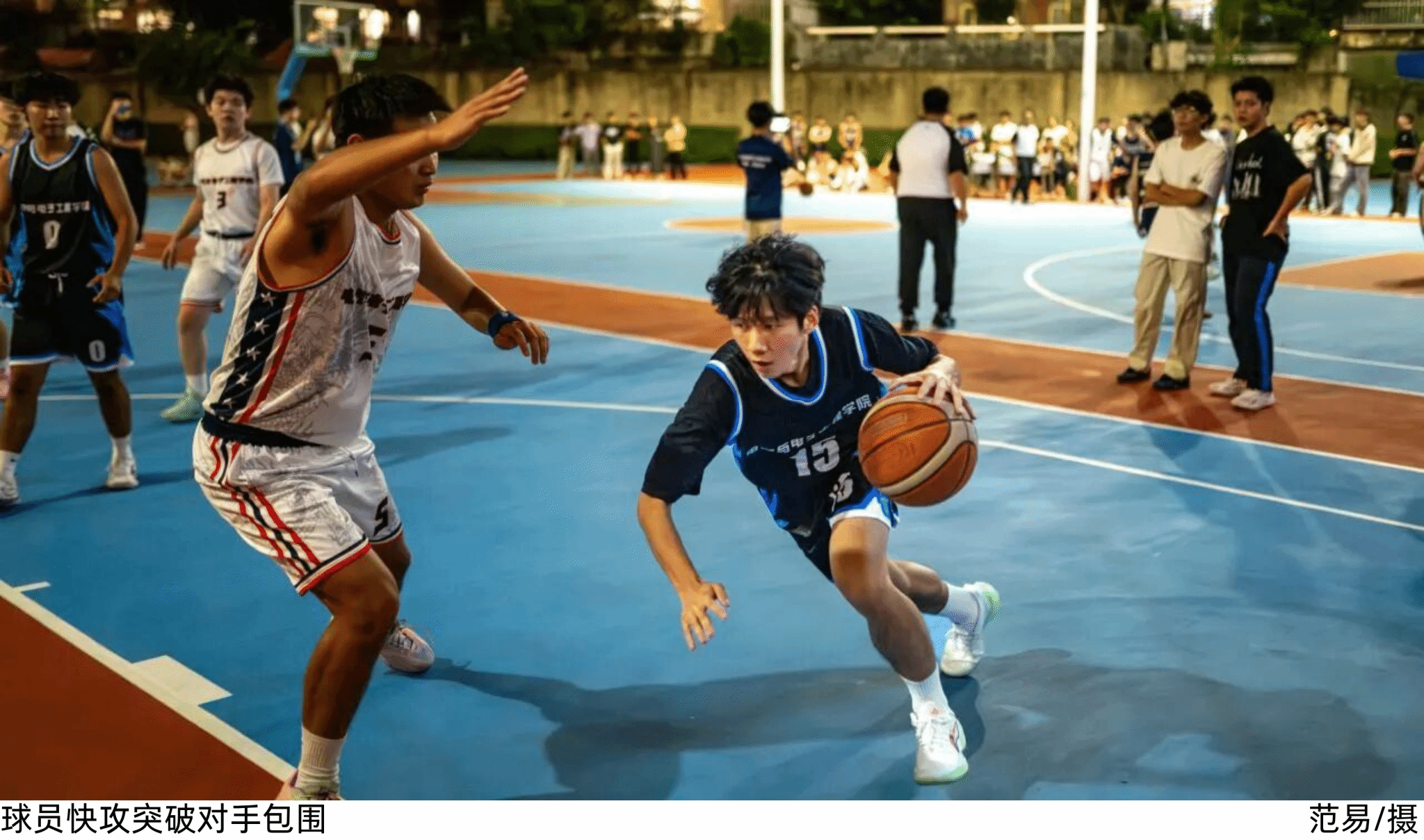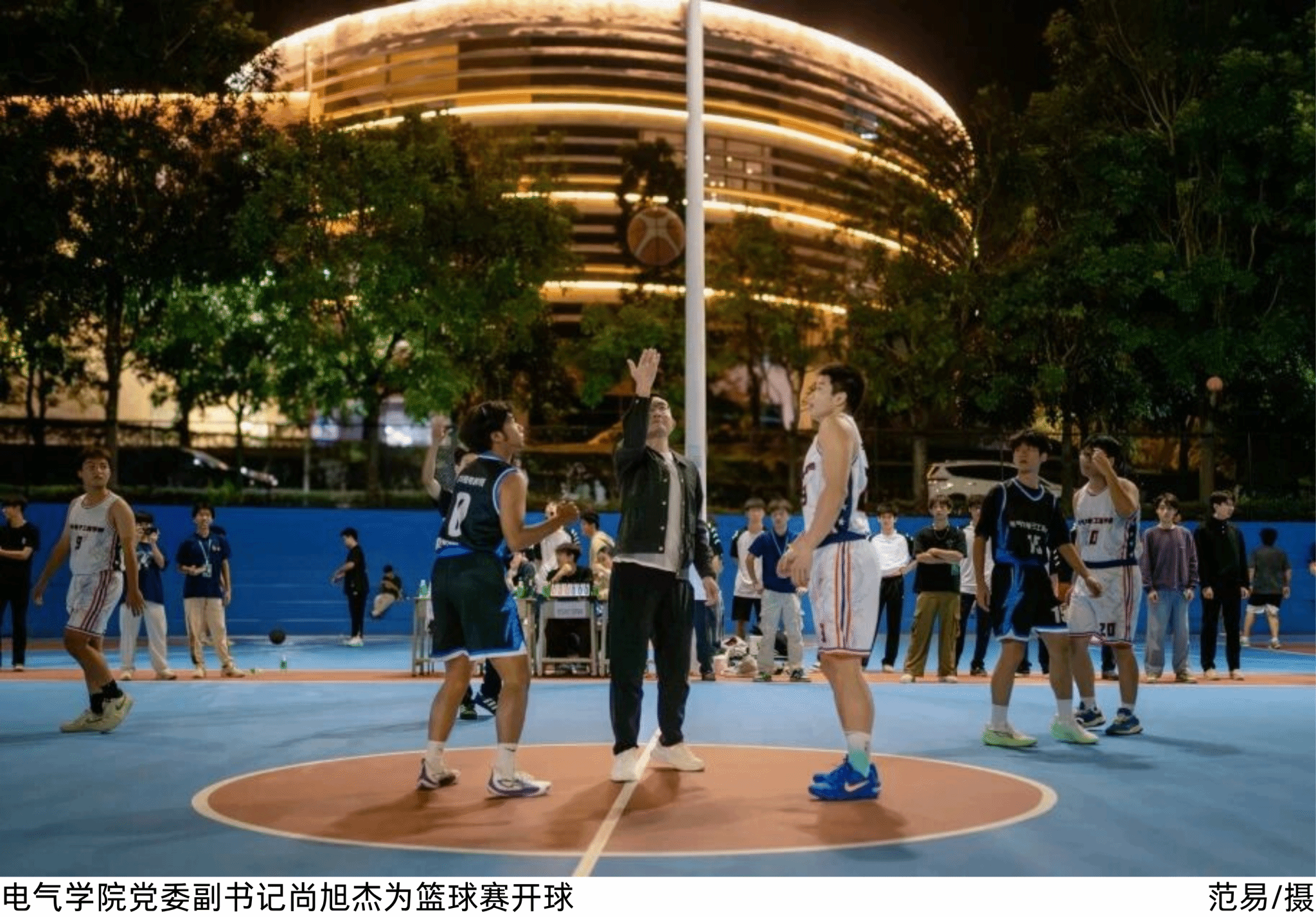 当晚19时整,伴随着现场师生的热烈掌声,尚旭杰副书记步入篮球场。揭幕战对阵的队伍身着整齐队服,精神饱满地在球场两侧列队。在裁判的引导下依次与尚旭杰副书记亲切击掌。副书记面带笑容传递鼓励,球员们眼神坚定,现场氛围愈发热烈。