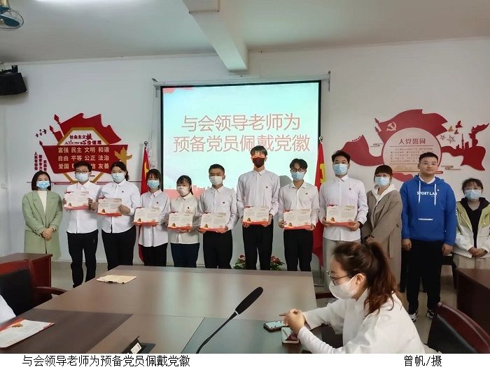 会议在庄严的国歌声中拉开了帷幕。叶家宜代表党组织宣读了2022年批准的29名预备党员人员名单。与会领导老师为预备党员佩戴党徽、发放贺卡。