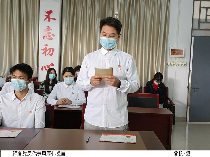 周厚伟代表新发展预备党员进行表态发言,他感谢党组织对自己的教育和培养,对自己提出了更高的要求,表示一定会响应党的号召,履行党员义务,做一名合格的党员,为党的事业奋斗终生。