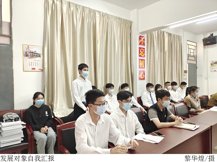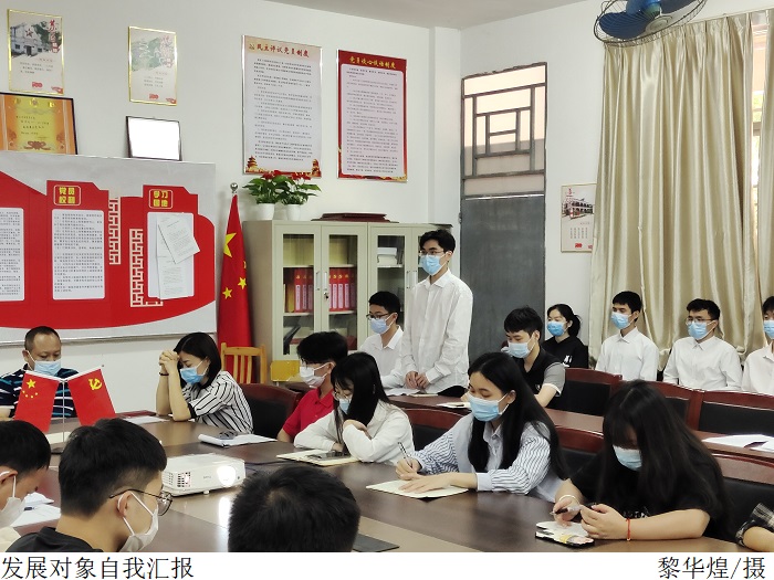 会上,通过发展对象向党组织汇报了对党的认识、入党动机、本人履历、家庭和主要社会关系情况,以及需向党组织说明的问题,入党介绍人对其能否入党、本人是否同意加入党组织表明意见和态度。员工党支部组织委员叶家宜代表支委会汇报了政审情况以及他们的现实表现和培养考察情况。