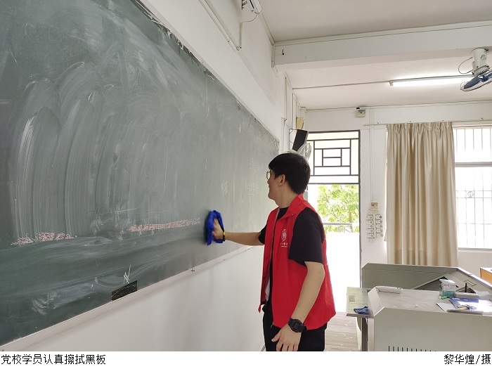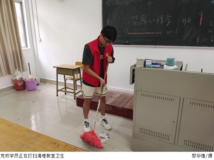 大清扫过程中,学员们根据分组安排来到指定的楼层,大家拿着抹布、脸盆、扫把、簸箕等工具,认真仔细打扫教学楼各个角落,将课桌、黑板擦抹干净整洁,有的学员还蹲在地上认真清理教室地上的垃圾物,真正做到不放过任何一个角落。经过全体学员们的辛勤劳动,教学楼呈现出整洁亮丽、活泼清新的新气象。学员周厚伟说到,本次清理校园卫生死角活动,不仅体现了电院学子良好的精神风貌和无私的奉献精神,而且进一步坚定了发展对象的理想信念,提高了思想觉悟,在接下来的学习培训过程中,我们将进一步把理论知识和社会实践相结合,全心全意为老师和同学们服务。