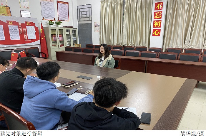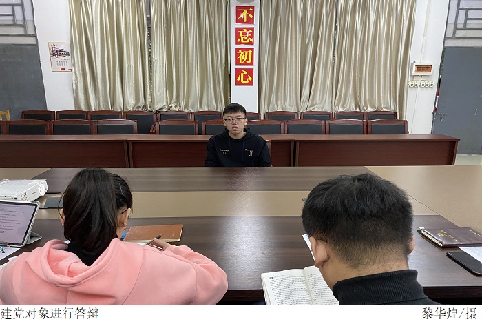 叶运黎书记指出开展此次建党对象答辩会的目的重在检验建党对象对党章党史的了解程度,从多方面考察他们的入党动机和个人思想态度的转变,他希望大家能够夯实党的理论学习,发挥先锋模范作用。答辩过程中,同学们从自我介绍、思想认识、学习生活等方面进行了自我陈述,剖析了自身存在的不足,细致地回答了党员老师提出关于党史党章的问题,充分展现了自己坚定的立场和决心。